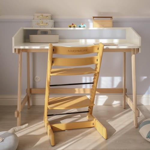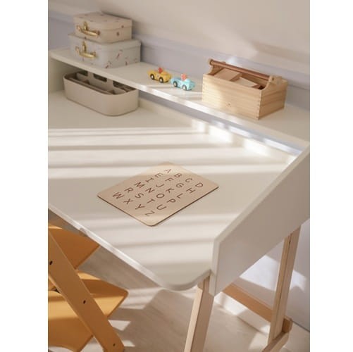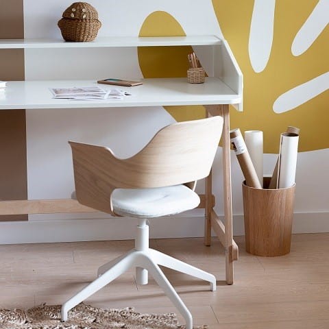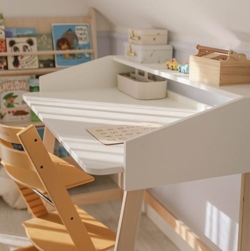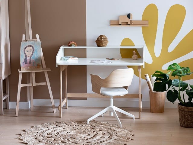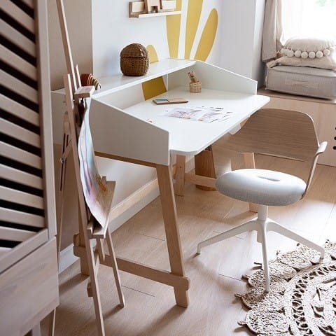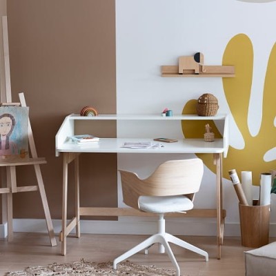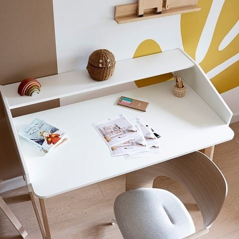 Piękne, stylowe biurko dziecięce w stylu skandynawskim i kolorze białym. Duża powierzchnia robocza i praktyczna półeczka nad blatem zapewnią komfort pracy przy odrabianiu lekcji. Eleganckie biureczko dla dzieci które pomieści zeszyty, bloki, kredki, listy miłosne, tablety, laptopy i dużo, dużo więcej. Uroku dodaje drewniana podstawa biurka w oryginalnym kształcie. Pasuje do innych mebli dziecięcych z kolekcji Basic.
