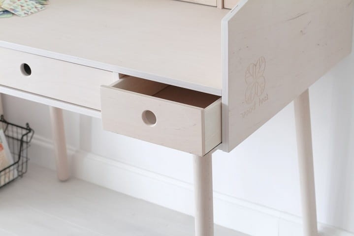 Sekretarzyk do pokoju dziecka z kolekcji River. Zgrabne biureczko dla dziecka które pomieści zeszyty, bloki, kredki, listy miłosne, tablety, laptopy i dużo, dużo więcej. Dostępne w wersji z nogami w kolorze naturalnego drewna. Rozmiar czterech górnych szufladek dopasowany jest do zeszytu wielkości A5. Dolne zewnętrzne szuflady mają dopasowany rozmiar do zeszytu A4. Z kolei, środkowa dolna szuflada pomieści wymiar dużego formatu A3 i jest wyposażona w bardzo dobrej jakości prowadnice z samodomykiem. Wymiar dolnego blatu roboczego to 42 x 100cm.