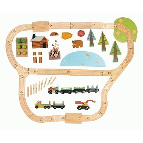Przeżyj wspaniałą leśną przygodę! 30 częściowy drewniany zestaw z kolejką zapewni wspaniałą zabawę na długie godziny! W tym pięknym zestawie znajdziecie lokomotywę z trzema wagonikami, które łączą się za pomocą magnesów, 27 małych belek drewna w różnych kolorach jak i ciężarówkę do transportu drewna z 9 długimi belkami drewna. Dzięki ukrytym magnesom w belkach, możemy je podnieść i załadować na ciężarówkę.