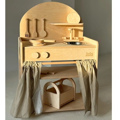 Kuchnia w kolorze naturalnego drewna, w zestawie z piękną zasłonką w krateczkę i zestawem akcesoriów:
