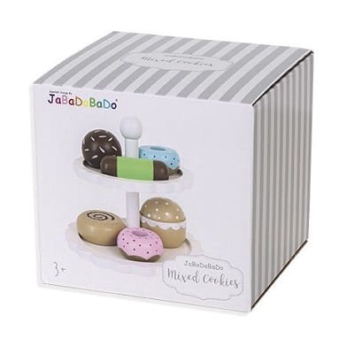 Piękna drewniana dwupoziomowa patera marki Jabadabado z uroczymi słodkościami wygląda smakowicie! W zestawie znajduje się sześć ciasteczek każdy pięknie wykonany, w uroczej pastelowej kolorystyce, z charakterystycznymi dla tej marki kropeczkami.