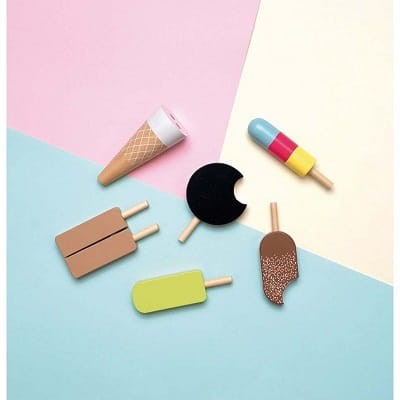 Drewniany zestaw lodów w stylu retro to nowość skandynawskiej marki Jabadabado, w zestawie znajduje się pudełko na lody oraz sześć sztuk lodów, każdy w innym smaku i o innym kolorze. Drewniane lody w pudełku do idealne uzupełnienie kuchennych akcesoriów, nieodzowne w zabawie w sklep czy restaurację.