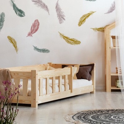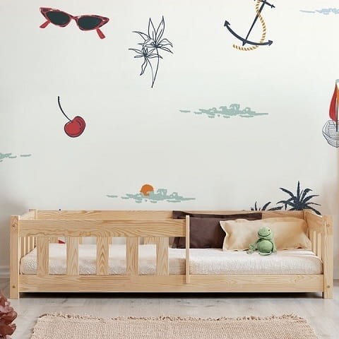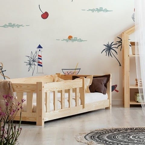 Drewniane łóżko dla dzieci z barierką, styl skandynawski