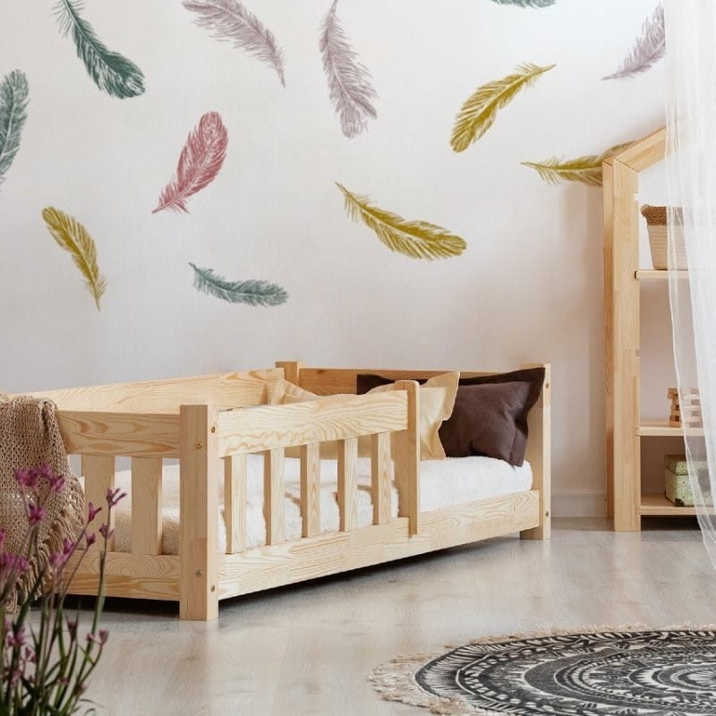 Drewniane łóżko dla dzieci z barierką, w stylu skandynawskim.