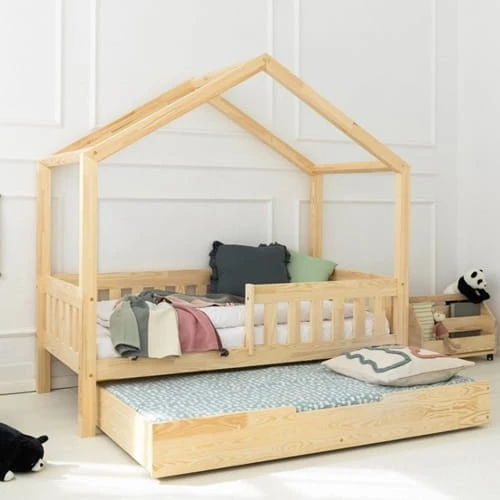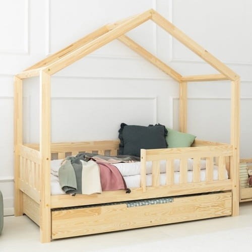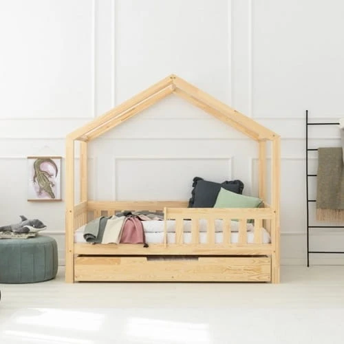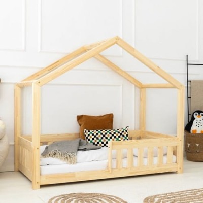 Drewniane łóżko domek dla dzieci styl skandynawski z barierką płotek