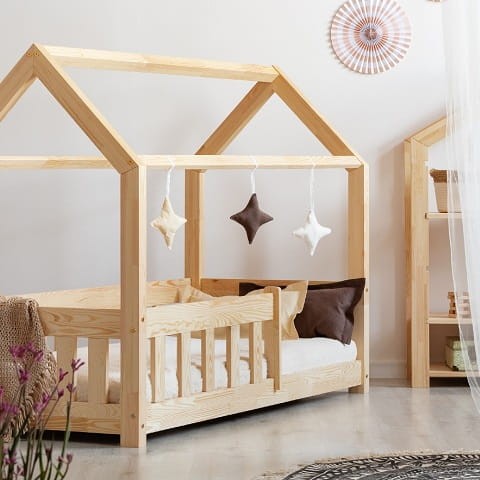 Drewniane łóżko domek dla dzieci z barierką płotek