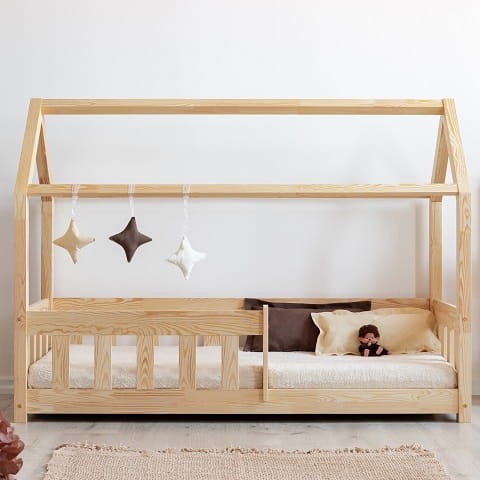 O takim łóżeczku marzą wszystkie dzieci. Łóżko domek w stylu skandynawskim to designerski akcent w pokoju dziecka, który zapewnia nie tylko komfortowe miejsce do wypoczynku ale jednocześnie ulubione miejsce do zabawy. Drewniana barierka - płotek zapewnia dodatkową ochronę. Łóżko domek wykonane jest z wysokiej jakości drewna sosnowego certyfikowanego klasy I (FSC) - Forest Stewardship Council. Łóżko jest solidne, o mocnej i sztywnej konstrukcji. Drewno użyte do produkcji łóżeczka nie jest lakierowane ani malowane a jedynie szczotkowane i szlifowane. Kolor: naturalne drewno. Polska produkcja.