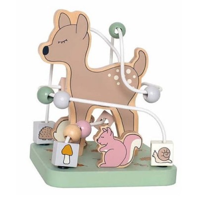 Drewniany edukacyjny labirynt - przeplatanka, las skandynawskiej marki Jabadabado to świetna zabawka sensoryczna dla każdego dziecka. Pomaga rozwinąć zdolności manualne oraz ćwiczy koordynację ręka-oko. Zadaniem malucha jest przeplatanie kolorowych koralików przez labirynt w formie rurek. Koraliki mają różne kształty i kolory, zachowane jednak w stonowanej pastelowej kolorystyce, co urozmaica dodatkowo zabawę. Niektóre koraliki są w kształcie zwierzątek. Dziecko może układać koraliki według własnego upodobania. To bardzo wpływa na kreatywność i wyobraźnie maluszka. Idealnie nadaje się na prezent na roczek!