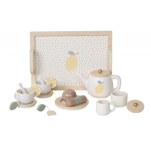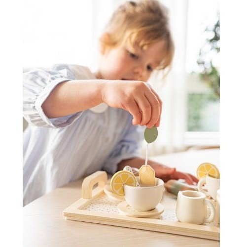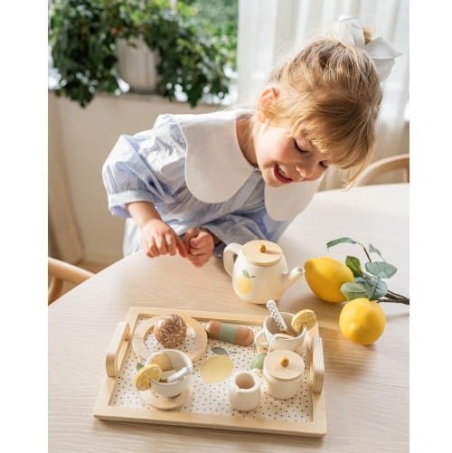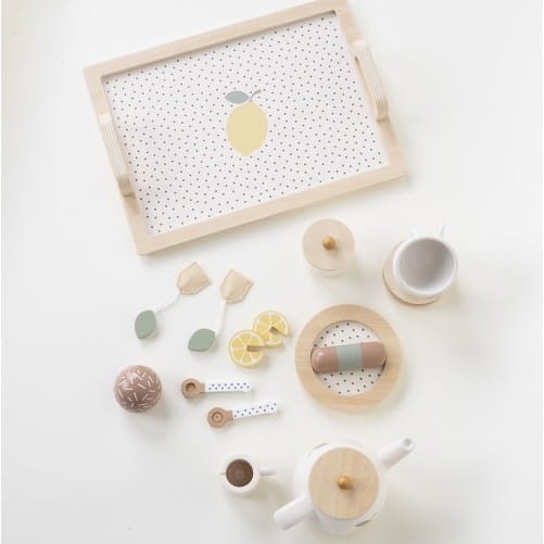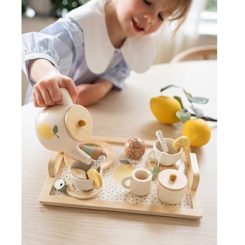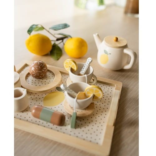 Uroczy, drewniany zestaw do herbaty dla dzieci, z motywem cytryny od Jabadabado. Idealny do zabawy w naśladowanie dorosłych. W zestawie z tacą z uchwytami ułatwiającymi przenoszenie serwisu.