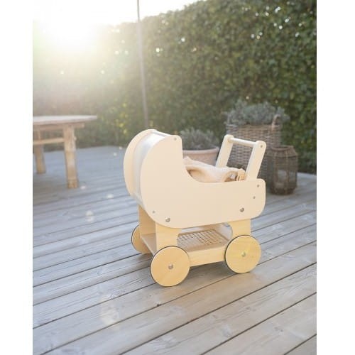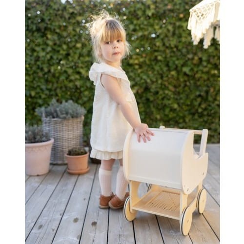 Uroczy drewniany wózek dla lalek w stonowanym, kremowym kolorze z elementami przypominającymi rattan to propozycja skandynawskiej marki Jabadabado. Idealny do usypiania i wożenia swojej kolekcji lalek, i pluszaków. Świetnie sprawdzi się na pierwsze piesze spacery, zapewniając brak nudy.