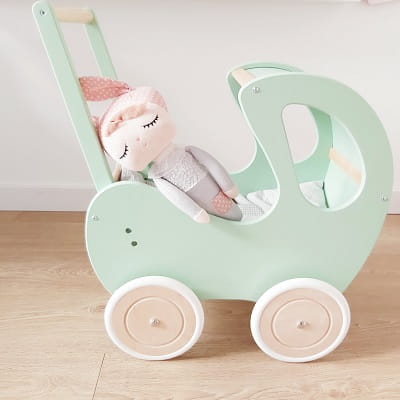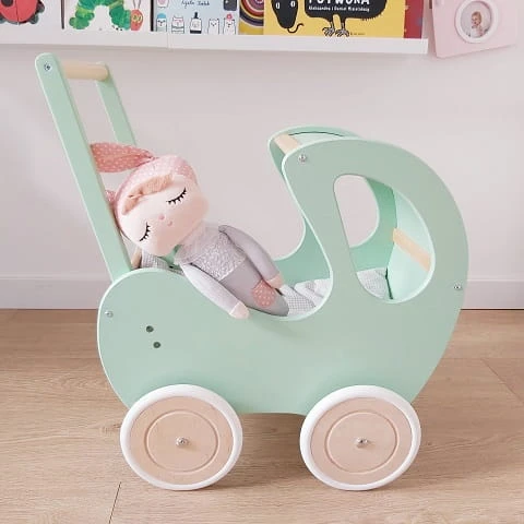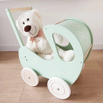Drewniany wózek dla lalek RETRO pchacz miętowy z drewnem