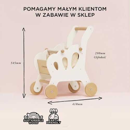 Zaprojektowany w Wielkiej Brytanii wózek jest wykonany z drewna pochodzącego ze zrównoważonych zasobów FSC®. Starannie wykonany i pomalowany farbami bezpiecznymi dla dzieci na neutralny biały kolor sprawia, że wszystkie jego elementy realistycznie odzwierciedlają prawdziwy i zarazem bardzo luksusowy wózek na zakupy.
