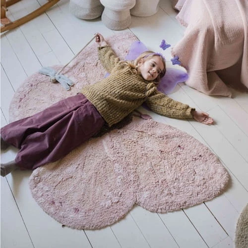 Dywan w kształcie motylka. Jest pełen małych, pięknych detali, w tym palety ośmiu różnych odcieni różu, które łączą się ze sobą, tworząc realistycznego motyla i czułki starannie wykonane ręcznie z bawełnianego sznurka, który można łatwo usunąć z dywanu przed praniem. Idealny wybór do pokoju dziecięcego. Czy jesteś gotowy, aby polecieć z nią na nowe horyzonty?
