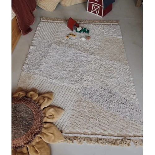 Dywan bawełniany do zabawy w kształcie prostokąta w naturalnych barwach, z paskami w różnych odcieniach szarości i beżu, doskonale odwzorowujący krajobraz farmy. Dzięki różnorodnym fakturom, dywan stymuluje zmysły i rozwój dziecka, a nowa, unikalna kombinacja tkaniny w stonowanych odcieniach dodaje mu ciepła i naturalnego uroku.
