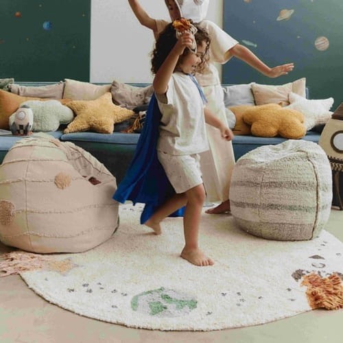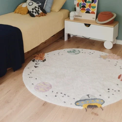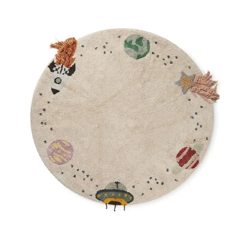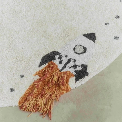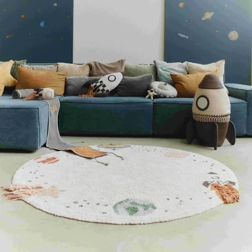 Przekształć pokój swojego dziecka w kosmiczną przygodę dzięki temu międzygwiezdnemu dywanowi z naturalnego płótna. Urocze wzory wokół obramowania przedstawiające trzy planety, rakietę, spadającą gwiazdę i UFO sprawiają, że dywan ten jest idealny dla młodych odkrywców i aspirujących astronautów.