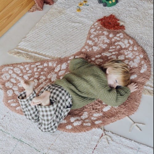 Koko, koko! Ręcznie wykonany dywan bawełniany Kura z kolekcji Farm to uroczy i funkcjonalny element wystroju pokoju dziecięcego. Z tłem w odcieniu terakoty i detalami w naturalnych kolorach, dywan idealnie odwzorowuje postać kury oraz jej pióra, a nogi zostały subtelnie wykończone sznurkowymi akcentami, co nadaje mu unikalnego charakteru. Wykonany z miękkiej, przyjaznej dla skóry bawełny, jest zarówno bezpieczny, jak i komfortowy w użytkowaniu. Dzięki możliwości prania w domowej pralce, utrzymanie go w czystości jest proste i wygodne. Dywan Kura to doskonały wybór dla rodziców, którzy szukają produktu łączącego estetykę, funkcjonalność i łatwość pielęgnacji, idealnie pasującego do każdego dziecięcego pokoju. Można go łączyć z innymi produktami z kolekcji Farm, tworząc inspirujący, wiejski klimat, który jest zarówno praktyczny, jak i pełen uroku.