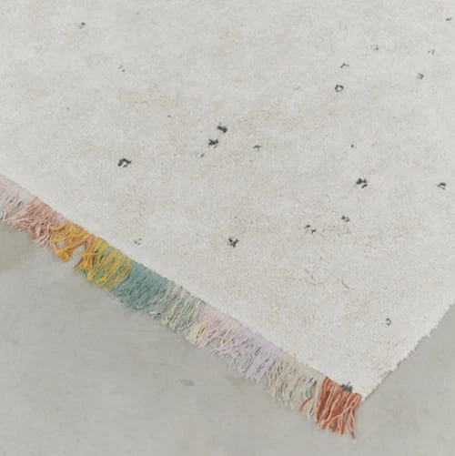 Huśtaj się wśród gwiazd dzięki dywanikowi do prania w pralce Stardust. Ręcznie wykonany prostokątny bawełniany dywan w naturalnym kolorze z małymi ciemnymi kropkami symulującymi gwiezdny pył w rozległej przestrzeni.