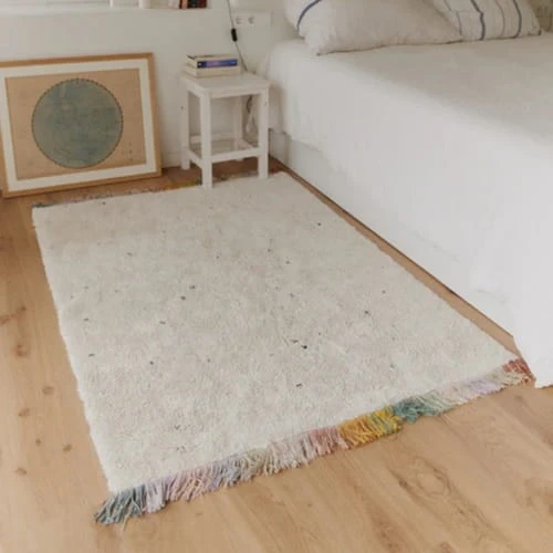Wykończony jest krótkimi frędzlami na krawędziach w różnych kolorach wynikających z mieszanki kolorów, które ożywiają kolekcję. Dywan, który nie tylko zdobi, ale także inspiruje. Niezbędny z osobowością dla tych, którzy szukają wyjątkowych elementów wystroju.