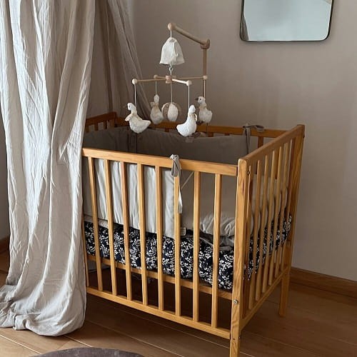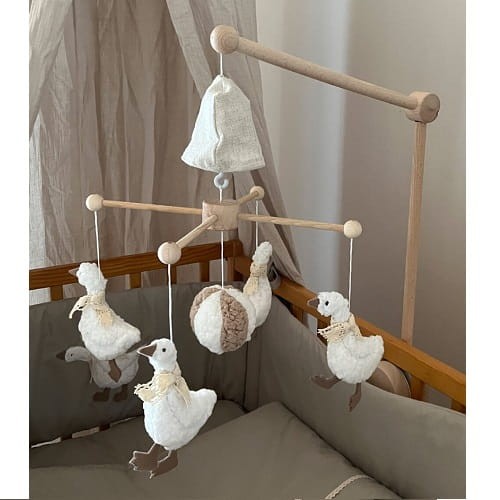 Karuzela do łóżeczka z pozytywką "Gąski " została wykonana z wysokogatunkowego drewna. Posiada obrotową pozytywkę ukrytą pod “kapturkiem” z filcu. Po nakręceniu zabawki - miękkie gąski delikatnie się obracają przez 4 minuty Specjalny rodzaj uchwytu pozwala umieścić karuzelę do łóżeczka ze szczebelkami. W dwóch zabawkach została umieszczona grzechotka. Karuzela pakowana jest w pudełko kartonowe, dzięki czemu jest to idealny pomysł na prezent..