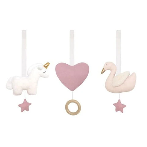 Zestaw trzech różowych zabawek zawieszek do stojaka gimnastycznego Jabadabado, każda w innym odcieniu i kształcie. Zestaw wykonany z materiału jest milutki i przytulny. W zestawie jednorożec z uchwytem do nauki chwytania, i ćwiczenia zręczności małych rączek, serce z drewnianym krążkiem -idealnym do chwytania oraz ukojenia dziąseł podczas ząbkowania, oraz łabędź-pozytywka, która po pociągnięciu za sznureczek wygrywa piękną, spokojną melodię.