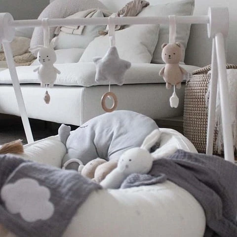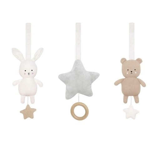 Zestaw trzech uroczych zabawek zawieszek do stojaka gimnastycznego baby gym, każda w innym odcieniu i kształcie. Zestaw wykonany z materiału jest milutki i przytulny. W zestawie królik z uchwytem do nauki chwytania, i ćwiczenia zręczności małych rączek, gwiazdka - pozytywka, która po pociągnięciu za sznureczek wygrywa piękną, spokojną melodię oraz miś do nauki chwytania.