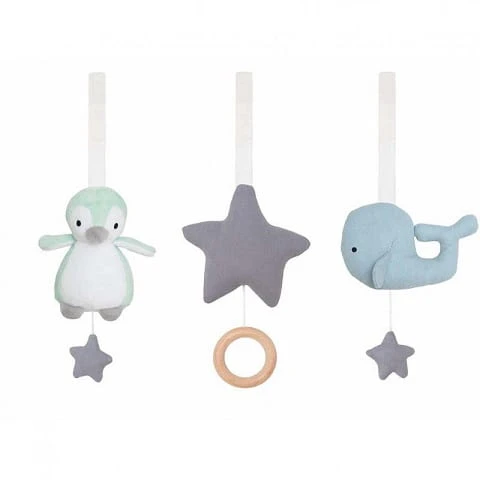 Zestaw trzech uroczych zabawek zawieszek do stojaka gimnastycznego, każda w innym odcieniu i kształcie. Zestaw wykonany z materiału jest milutki i przytulny. W zestawie królik z uchwytem do nauki chwytania, i ćwiczenia zręczności małych rączek, gwiazdka z drewnianym krążkiem -idealnym do chwytania oraz ukojenia dziąseł podczas ząbkowania, oraz pingwin pozytywka, która po pociągnięciu za sznureczek wygrywa piękną, spokojną melodię i uroczy wieloryb.