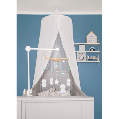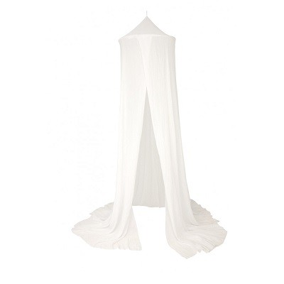 Baldachim w kolorze białym będzie się pięknie prezentował w pokoju małej księżniczki. Można go zamontować nad łóżkiem lub wykorzystać osobno jako namiot do zabawy. Może pełnić również funkcję moskitiery lub ochrony przed nadmiernym nasłonecznieniem. Wykonany z materiału wysokiej jakości, który jest wytrzymały i odporny na promienie słoneczne a jednocześnie lekki jak mgiełka. Materiał jest lekko przeźroczysty i pięknie się układa. Baldachim można zamocować do sufitu.
