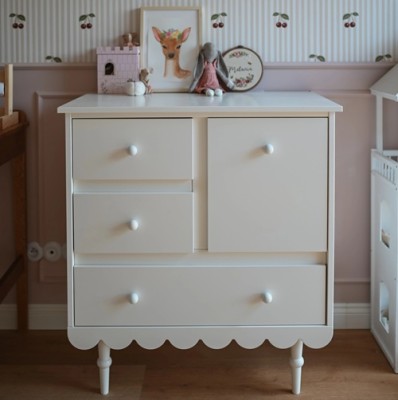 Niezwykle urokliwa komoda dziecięca w stylu retro w kolorze białym. Posiada trzy praktyczne szuflady oraz szafkę. Zarówno szuflady jak i drzwi wyposażone są w wysokiej jakości prowadnice oraz zawiasy z samodomykiem. Komoda Babushka będzie się pięknie prezentowała w pokoju dziewczynki i chłopca.