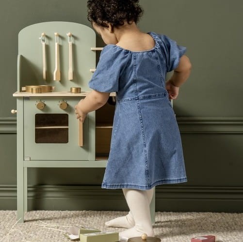 Urocza drewniana kuchnia dla dzieci w kolorze szałwiowym