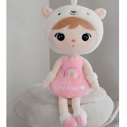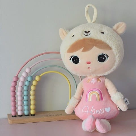 Oryginalna Lalka Metoo Alpaka w kolorze rożowym w wersji spersonalizowanej - z imieniem Twojego dziecka na sukience.