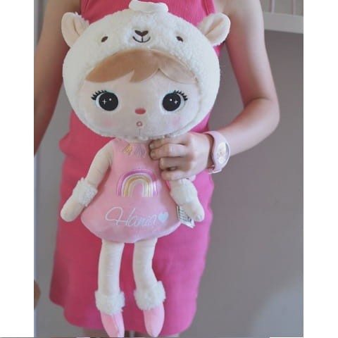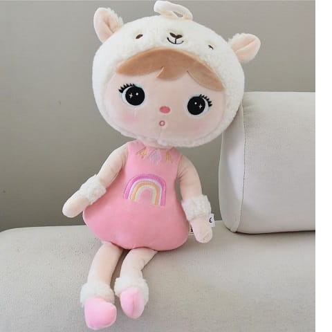 Lalka wykonana jest z miękkiego, milutkiego materiału w pastelowych kolorach. Nasze pluszowe alpaki doskonale sprawdzą się podczas usypiania malucha, jak i do zabawy czy odgrywania ról dla starszego dziecka. Alpaka ma interesujące dzieci szczegóły takie jak duże oczy i rzęsy, kolorową tęczę i różne tekstury materiału. Lalki Metoo są leciutkie i poręczne mimo swoich dosyć dużych rozmiarów. Na czubku głowy mają zawieszkę, więc łatwo ją złapać w małe rączki lub powiesić na ścianie jako ozdoba pokoiku dziecięcego.