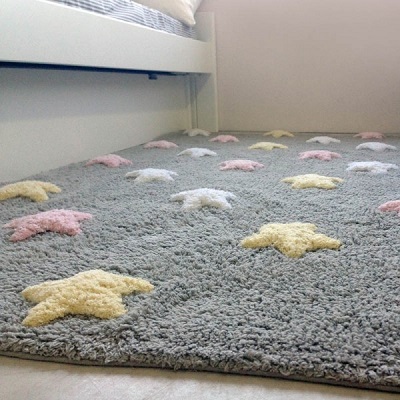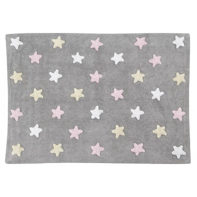 Dywan do prania w pralce, 100% naturalna bawełna. Dywan w kolorze szarym z kolorowymi gwiazdkami.