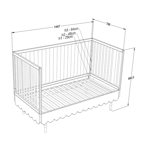 Posiada 3 poziomy regulacji materaca, dodatkowo jedna z ramek bocznych posiada 3 wyjmowane szczebelki aby umożliwić już starszemu dziecku samodzielne wychodzenie z łóżeczka.
