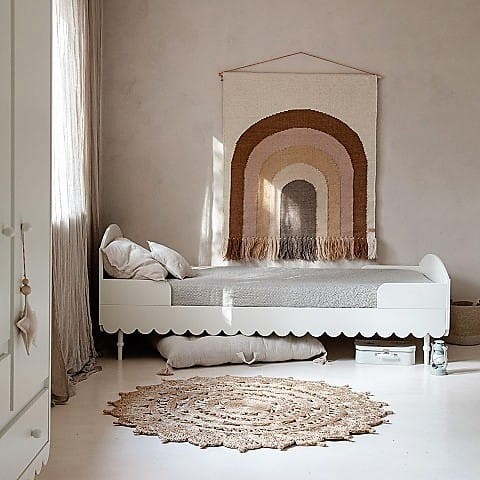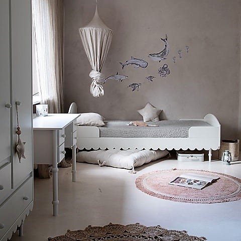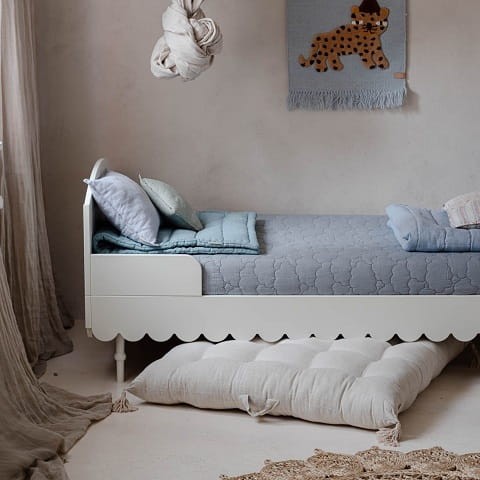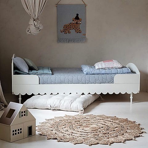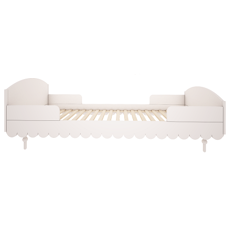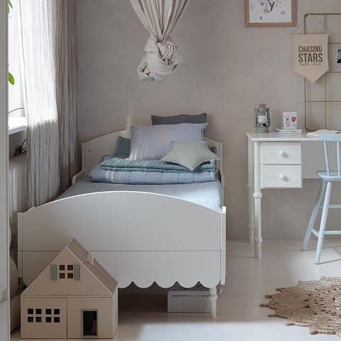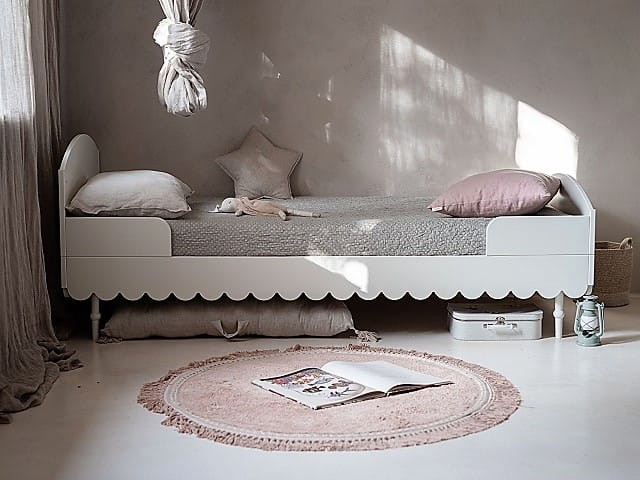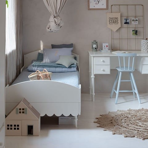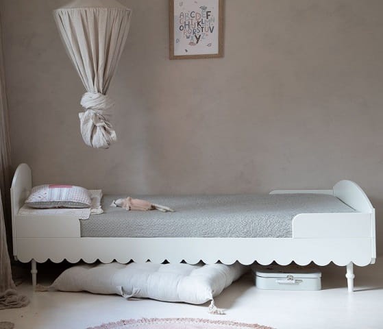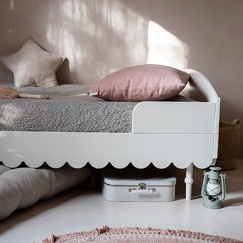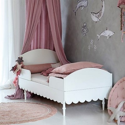 Niezwykle urokliwe łóżko dziecięce w stylu retro w kolorze białym. Odległość od podłogi do falbanki to 17cm. Listwy boczne zabezpieczające można demontować - nie są one integralną częścią łóżka. Do łóżka pasuje materac o wymiarach 90 x 200 cm.