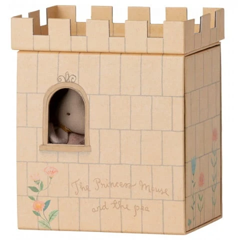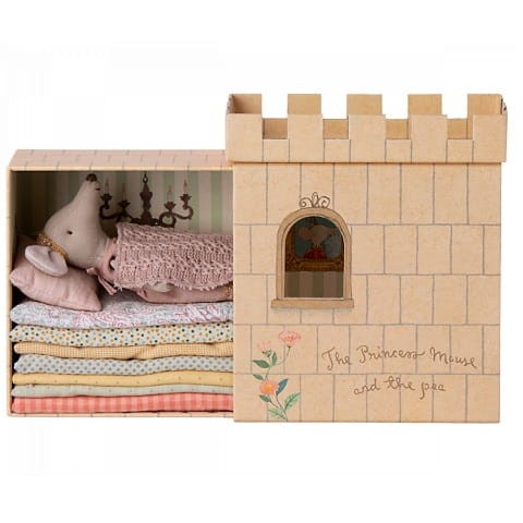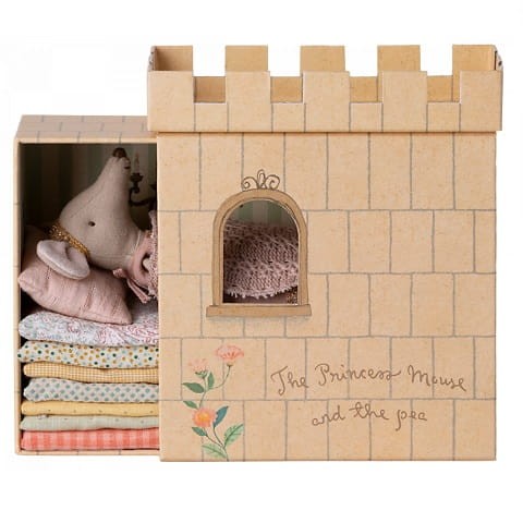Inspiracją do stworzenia tego zestawu Maileg jest słynna bajka Księżniczka na ziarnku grochu. W zestawie zamek z materacami, groszek i myszka księżniczka w różowej sukience.