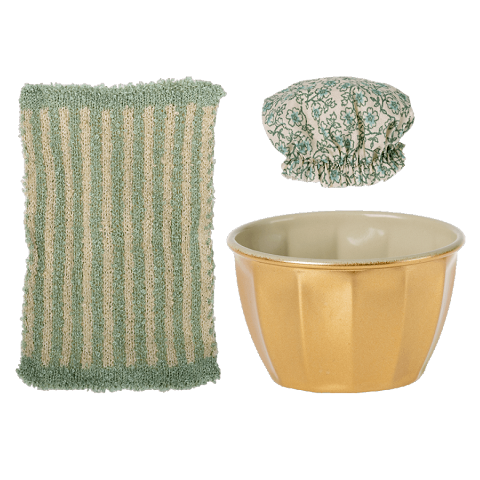 Myszka Starsza Siostra Maileg w kąpieli. W zestawie ze złotą wanną, ręczniczkiem w paseczki i czepkiem na głowę do kąpania.