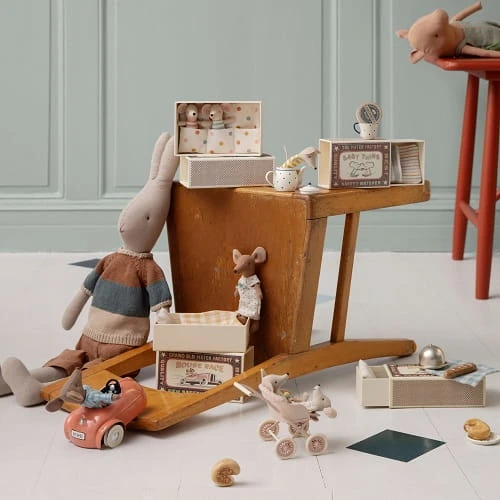Świetnie sprawdzi się podczas zabawy w odgrywanie scenek rodzinki Maileg. Idealny prezent dla każdego przedszkolaka. Praktyczne pudełeczko można zabrać ze sobą do babci lub na wycieczkę.