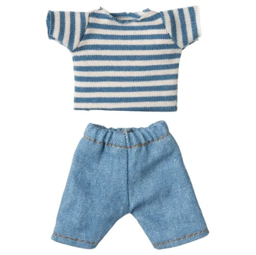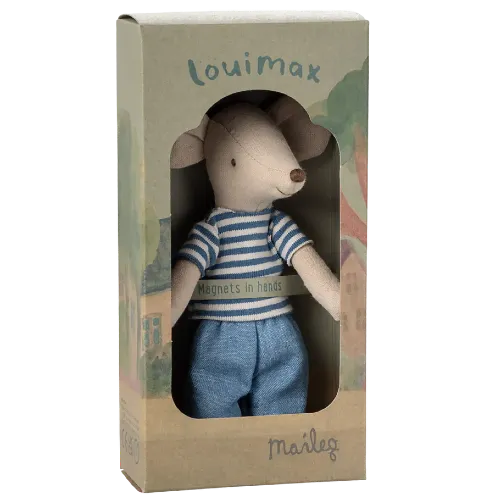 Myszka Maileg Starszy Brat z kolekcji 2025. Myszka ma na imie LouiMax. Jest ubrana jest w koszulkę w niebieskie paski i dżinsowe spodnie. Ma magnesy w łapkach i jest sprzedawana w bardzo ładnym ozdobnym pudełku z okienkiem.