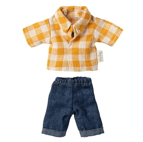 Myszka Tata z kolekcji 2025. Tata jest ubrany jest w koszulkę w kratkę i dżinsowe spodnie.