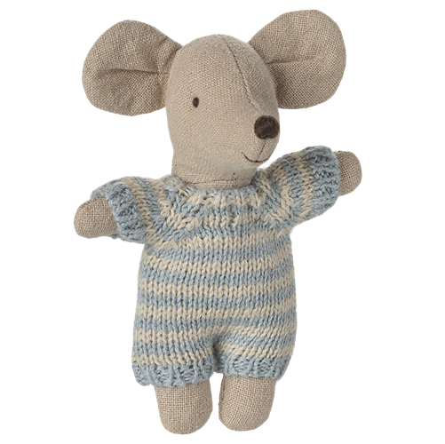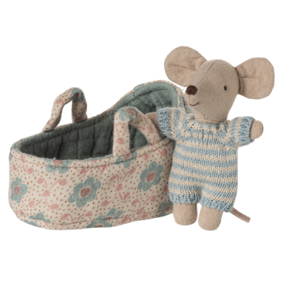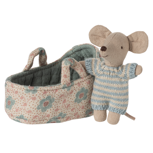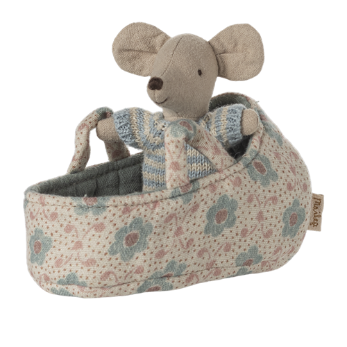 Myszka Maileg niemowlę - chłopiec w nosidełku. Myszka Baby Boy Mouse ma dzianinowe śpioszki w niebieskie paseczki. Ubrania i pościel są uszyte z miękkich tkanin z niepowtarzalnymi nadrukami i piękną kolorystyką.