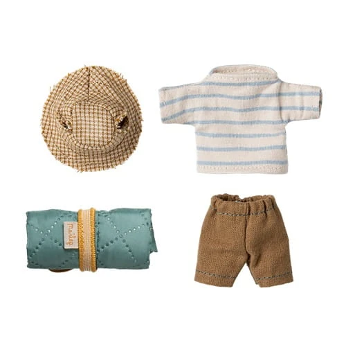 Myszka wędrowna Maileg Starszy Brat podróżnik ze śpiworkiem na plecach i kapeluszem. Myszka jest doskonale przygotowana na pieszą wycieczkę przyrodniczą. Myszka starszy brat ubrana jest w wygodne spodenki i koszulkę w paski, na głowie ma kapelusz z otworkami na uszy. Myszka ma magnesy w łapkach. Myszki wędrowne ze śpiworkami są idealne do zabawy w odrywanie ról podczas wakacyjnej wyprawy. Polecamy również namiot Maileg do zabawy (do kupienia osobno)