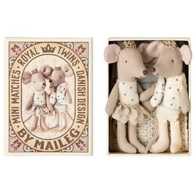 Maileg Myszki bliźniaki Royal Twins z kolekcji 2025, to para myszek bliźniaków, które zamieszkują urokliwe pudełko od zapałek, które służy jako ich łóżeczko. Każda myszka ma wyjątkowe ubrania i koronę, dodającą jej królewskiego wdzięku. Ubrania oraz pościel wykonane są z miękkich tkanin o niepowtarzalnych nadrukach, co podkreśla wysoką jakość tych zabawek.