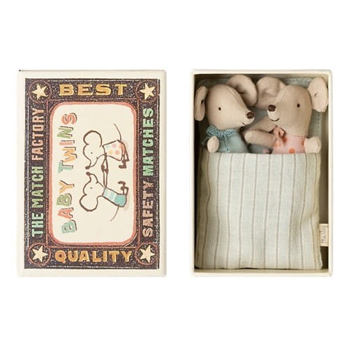 Myszki Maileg Twins z kolekcji 2025 to myszki bliźniaki, które mieszkają w pudełku od zapałek w wspólnym śpiworku w błękitne paseczki. Myszki Bliźniaki Maileg to chłopiec i dziewczynka, które maja urocze śpioszki - jedno maleństwo w kropeczki a drugie w gwiazdki. Ubrania i pościel są uszyte z miękkich tkanin z niepowtarzalnymi nadrukami i piękną kolorystyką.