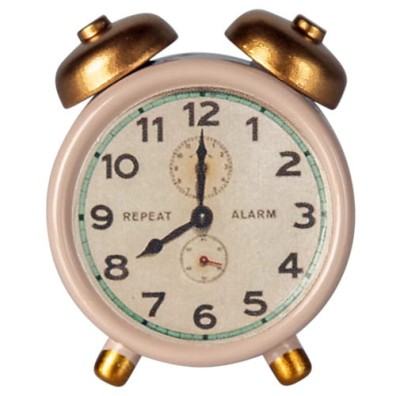 Metalowy budzik - zegarek dla myszek Maileg z kolekcji 2025. Idealnie pasuje do małego stolika nocnego. Budzik jest wykonany z metalu i ma wiele detali, dzięki którym wygląda jak prawdziwy.