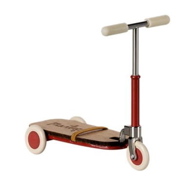 Hulajnoga dla myszek Maileg z kolekcji 2025. Hulajnoga ma metalowy drążek w kierownicy, dzięki któremu myszki z magnesami w łapkach mogą trzymać się kierownicy.