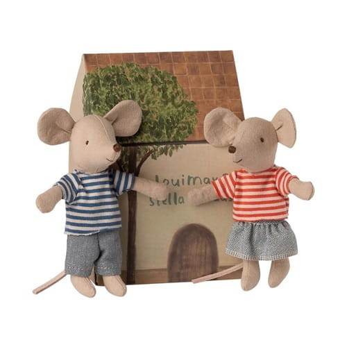 Maileg myszki młodszy brat i młodsza siostra LouiMax i Stella + kartonowy domek
