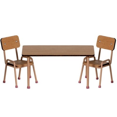 Prostokątny, drewniany stół z 2 krzesłami dla króliczków i myszek Maileg. Wykonany z drewna bukowego z metalowymi nogami. Świetnie sprawdzi się podczas zabaw z myszkami Maileg jako wyposażenie domu dla lalek. Wspaniały prezent dla dzieci od 3 roku życia. Może również służyć jako ławka szkolna z 2 krzesłami.