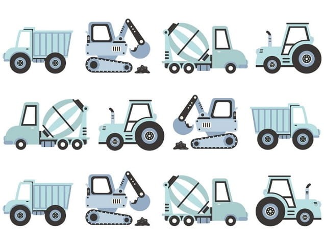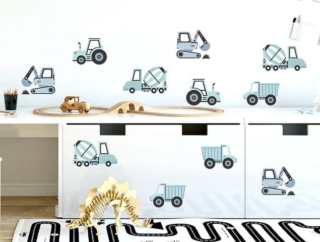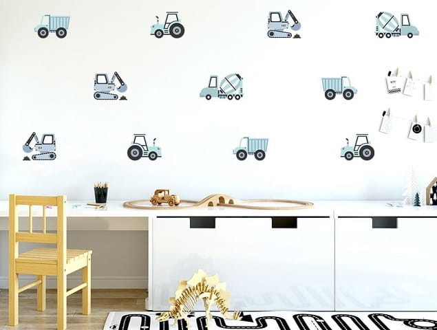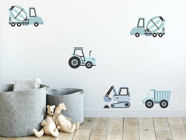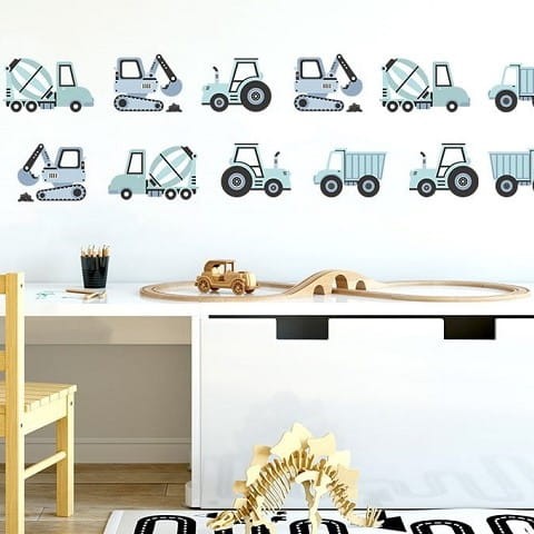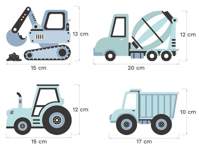 Seria naklejek dla dzieci pojazdy to propozycja dekoracji pokoju chłopca. Zamień pokój dziecka w prawdziwy plac budowy, dzięki serii naklejek, w których skład wchodzą: koparki, betoniarki, traktory i wywrotki.