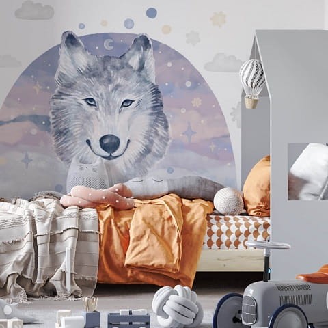 W skład zestawu wchodzą: wilk na tle (119x82 cm) oraz komplet dodatkowych elementów (chmurki, kropki, gwiazdy).