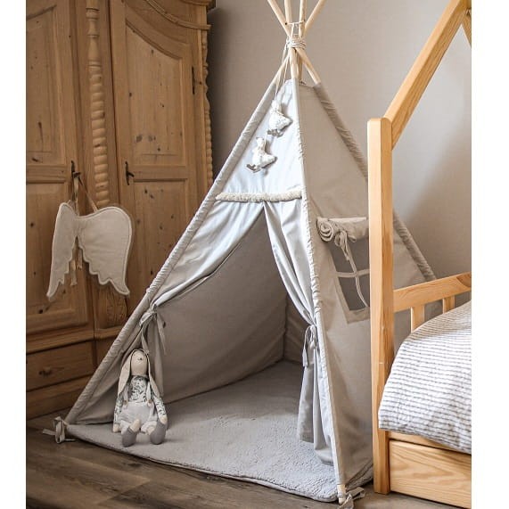 Namiot tipi dla dzieci z matą podłogową szary + zawieszki gąski